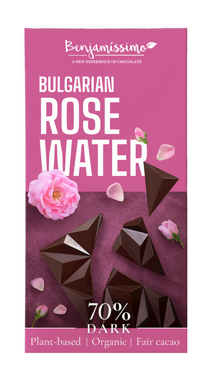miazga kakaowa*, cukier trzcinowy*, tłuszcz kakaowy*, woda różana z Róży damasceńskiej* 1,3 %, emulgator: lecytyny (ze słonecznika*). (*certyfikowany składnik ekologiczny). Masa kakaowa minimum 70 %.