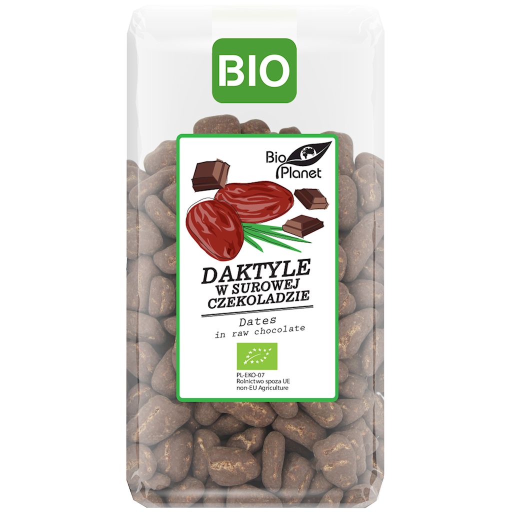 Ekologiczne suszone daktyle oblane czekoladą z nieprażonych ziaren kakaowca, słodzoną cukrem kokosowym. Stanowią wyśmienitą samodzielną przekąskę, również dla osób na diecie wegańskiej.