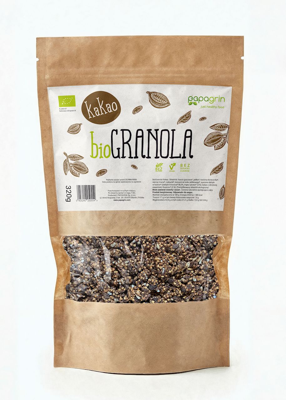 Odkryj tajemnicę naszego chrupania. Granola kakaowa to manufakturowy produkt, w którym kaszę gryczaną łączymy z nasionami, suszonymi owocami i kakao. Powoli wypiekana, dzięki czemu pozostaje idealnie chrupiąca i zachowuje głęboki, czekoladowy aromat. Poczuj różnicę, jaką daje pasja i rzemiosło.
