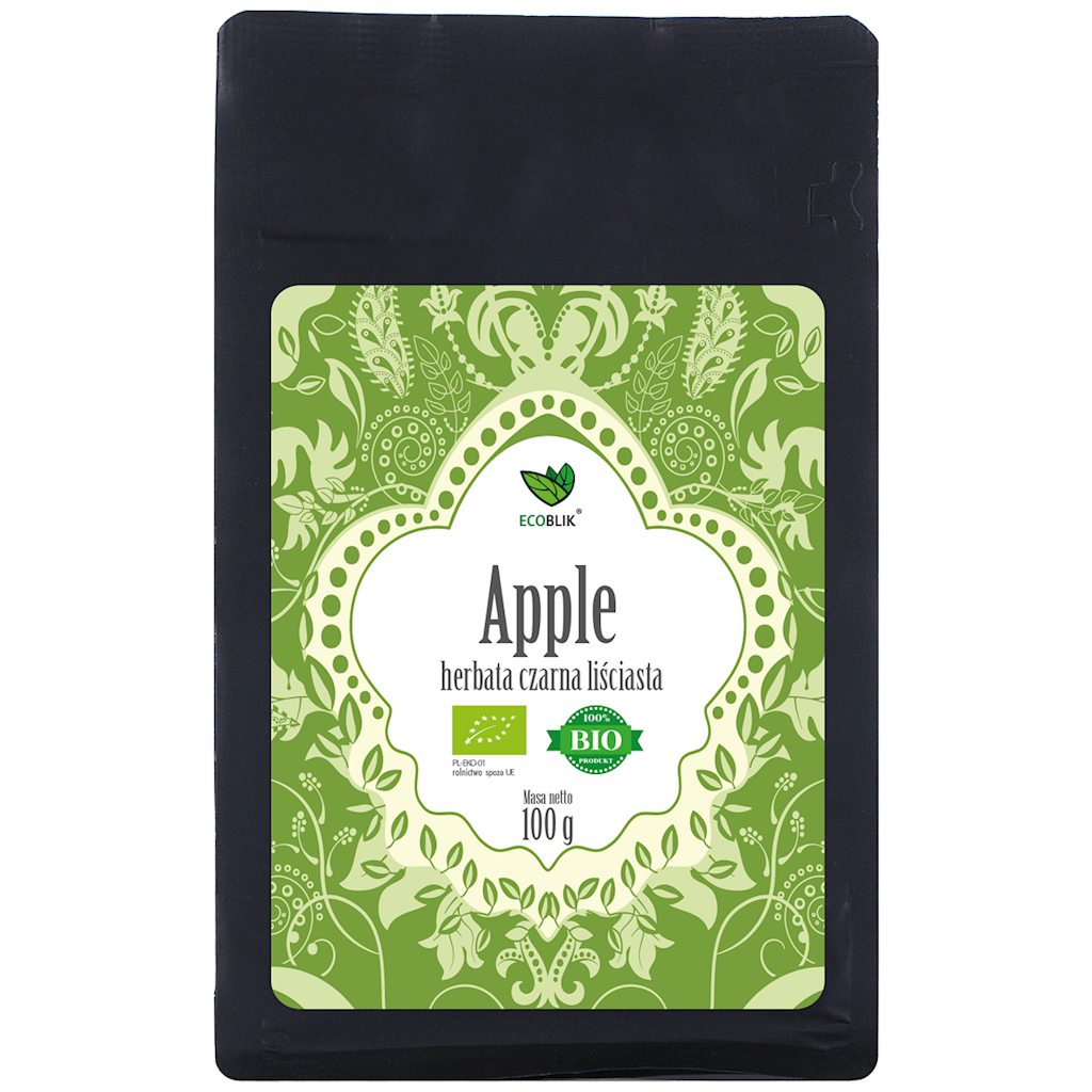 Herbata czarna APPLE EKO to mieszanka trzech ekologicznych czarnych herbat z dodatkiem suszonego jabłka bio. Charakteryzuje się intensywnym aromatem czarnej herbaty, z wyczuwalnym smakiem jabłka.