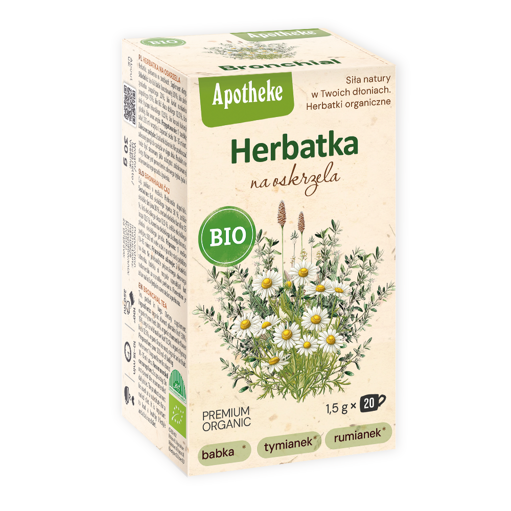 Suplement diety. Tymianek pospolity wspomaga zdrowie górnych dróg oddechowych i wspomaga układ odpornościowy. Babka lancetowata, rumianek pospolity, ślaz dziki i hyzop lekarski pomagają w utrzymaniu zdrowia układu oddechowego.