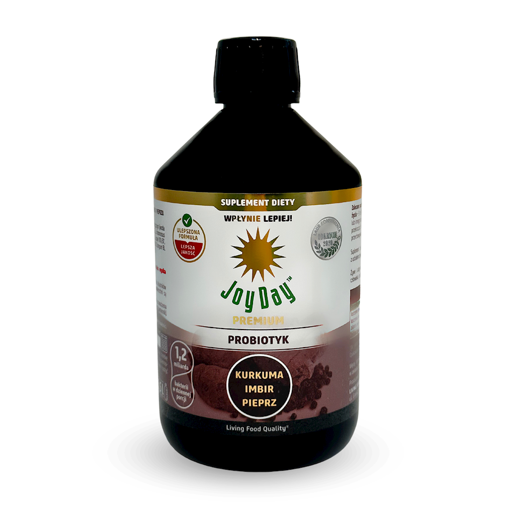 zestaw żywych szczepów bakterii probiotycznych w postaci płynnej (4×10*7jtk/ml) (Lactobacillus rhamnosus GG, Lactobacillus rhamnosus LR 04, Lactobacillus rhamnosus LR 05, Lactobacillus acidophilus LA 1, Lactobacillus delbrueckii ssp. bulgaricus LB 2, Lactobacillus casei 101/37, Lactobacillus plantarum LP 02, Lactobacillus plantarum LP 01, Lactobacillus fermentum LF2, Bifidobacterium breve BL 10, Bifidobacterium breve Bbr 8, Bifidobacterium longum BL 03, Bifidobacterium animals ssp. lactis Bi 1, Streptococcus thermophilus Z57, Streptococcus thermophilus 9Y), ekstrakt z fermentowanych składników roślinnych* 40% (w tym korzeń kurkumy* 49%, korzeń imbiru* 49%, ziarna pieprzu* 2%) (*certyfikowany składnik ekologiczny)