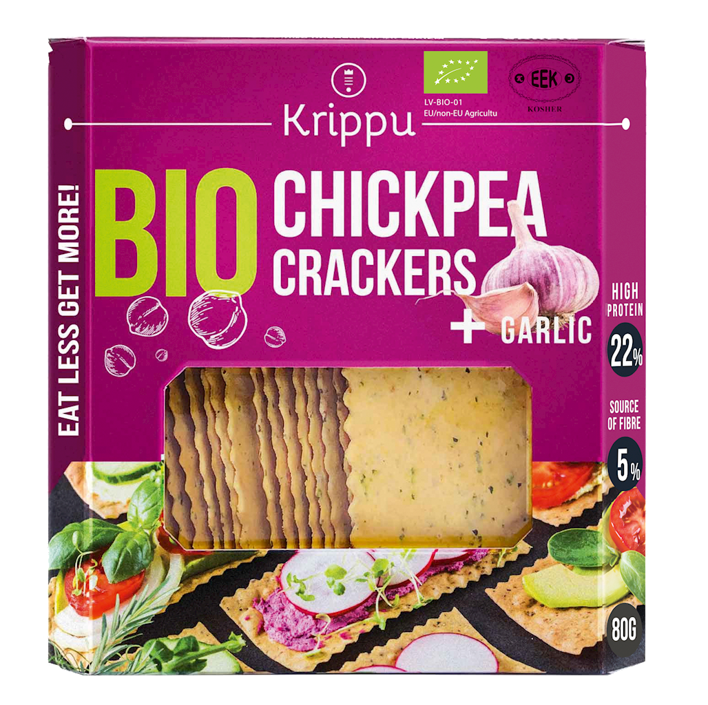 Krakersy z ciecierzycy KRIPPU zawierają ponad 20% białka, co plasuje je wśród produktów o najwyższej zawartości białka pod względem wartości odżywczej.