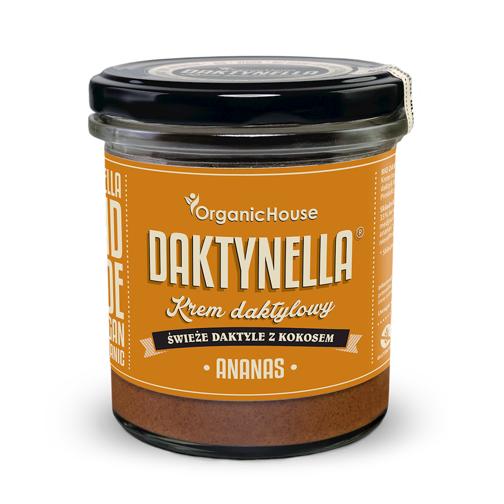 Daktynella OrganicHouse to niskokaloryczny krem na bazie świeżych ekologicznych daktyli medjool, kokosa i ananasa – prawdziwa czysta etykieta. Kluczem doskonałego smaku są najwyższej jakości składniki. Daktynella świetnie smakuje…prosto ze słoika, a także z naleśnikami, pieczywem, jogurtem z płatkami, orzechami, ziarnami i owocami. Polecamy również na gorąco ze świeżymi truskawkami.
