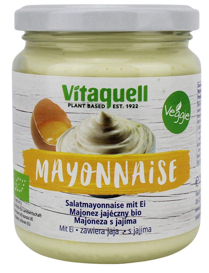 olej słonecznikowy*, woda, żółtko JAJA* (7 %), musztarda* (GORCZYCA*, ocet winny*, sól morska, sok z cytryny*, kurkuma*), ocet winny*, nierafinowany cukier trzcinowy*, sól morska, olejek z cytryny*. (*certyfikowany składnik ekologiczny)