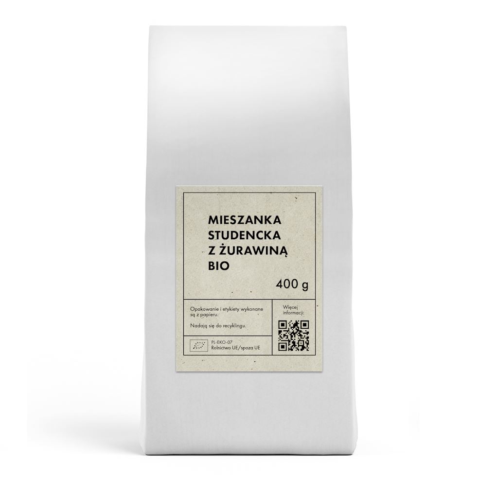 Ekologiczna mieszanka studencka jest oryginalną przekąską skomponowaną na bazie orzechów i suszonych owoców. Doskonała do ciast, wypieków oraz do bezpośredniego spożycia.