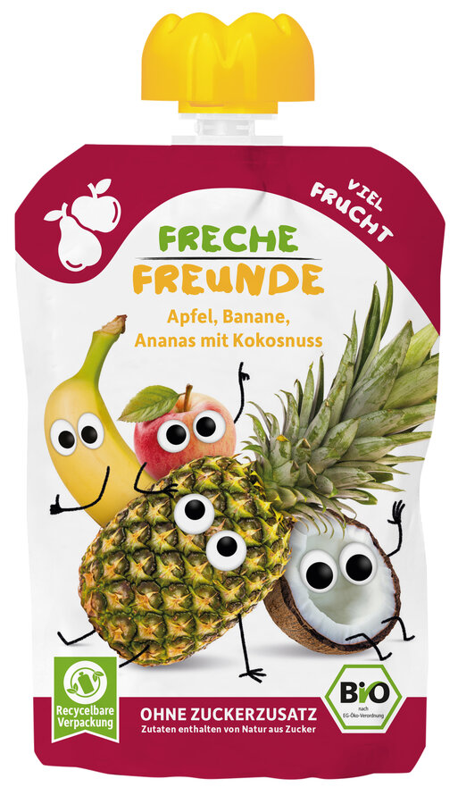 przecier jabłkowy* 48,5 %, przecier bananowy* 33 %, sok z ananasa* 10,5 %, napój kokosowy* 8 %(miazga kokosowa*, woda). (*certyfikowany składnik ekologiczny)