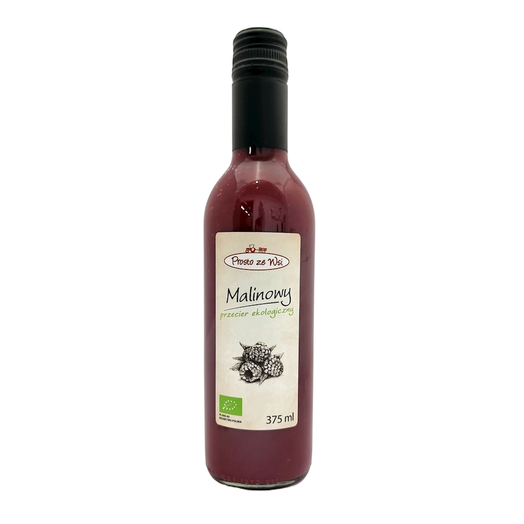 Malinowy ekologiczny sok przecierowy NFC (nie z koncentratu), bez pestek, niesłodzony, pasteryzowany. Zrobiony metodą rzemieślniczą ze świeżych, polskich malin.